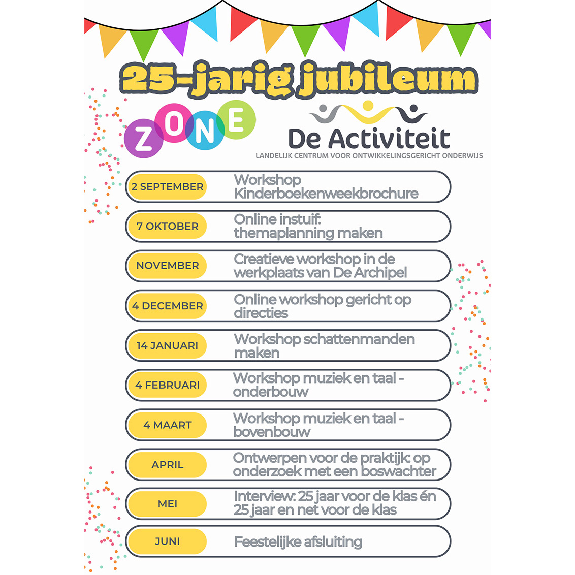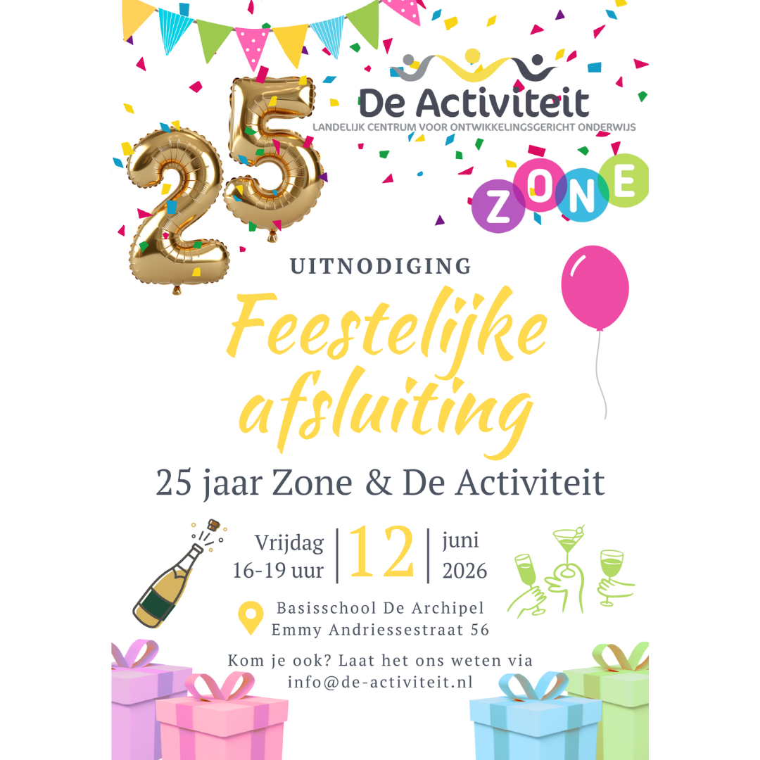 Dit schooljaar bestaan De Activiteit en Tijdschrift Zone 25 jaar! 🎉We willen het jubileumjaar graag samen met jullie afsluiten. Op vrijdag 12 juni 2026 ben je daarom van harte welkom bij